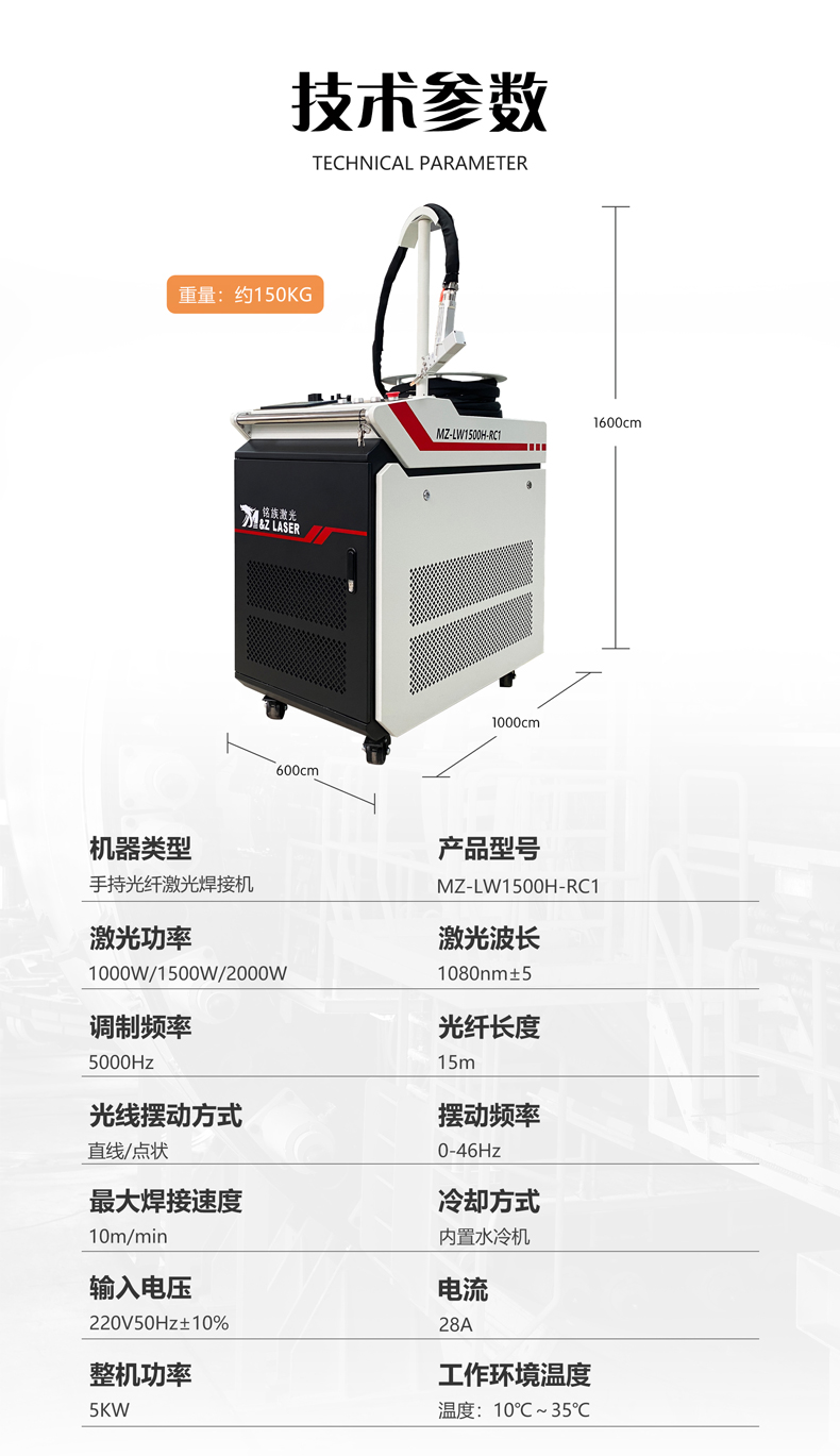 手持式光纖激光焊接機(jī)MZ-1000/2000W-RC,采用全新一代光纖北京熱刺/武漢銳科激光器,配置超強(qiáng)擺動(dòng)焊槍,漢利冷水機(jī)。具有操作簡單、焊縫美觀、焊接速度快、無耗材的優(yōu)勢(shì)。填補(bǔ)激光設(shè)備行業(yè)手持式焊接的空白。